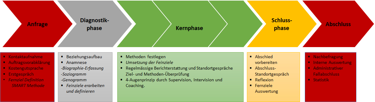 Nach dem ersten Kontakt wird die Kostengutsprache der zuständigen Behörde eingeholt. Ist diese erfolgt, findet ein erstes Gespräch mit allen Beteiligten statt. In diesem Gespräch wird die Zielsetzung einer Massnahme gemeinsam besprochen und zuerst mündlich und anschliessend schriftlich festgehalten.